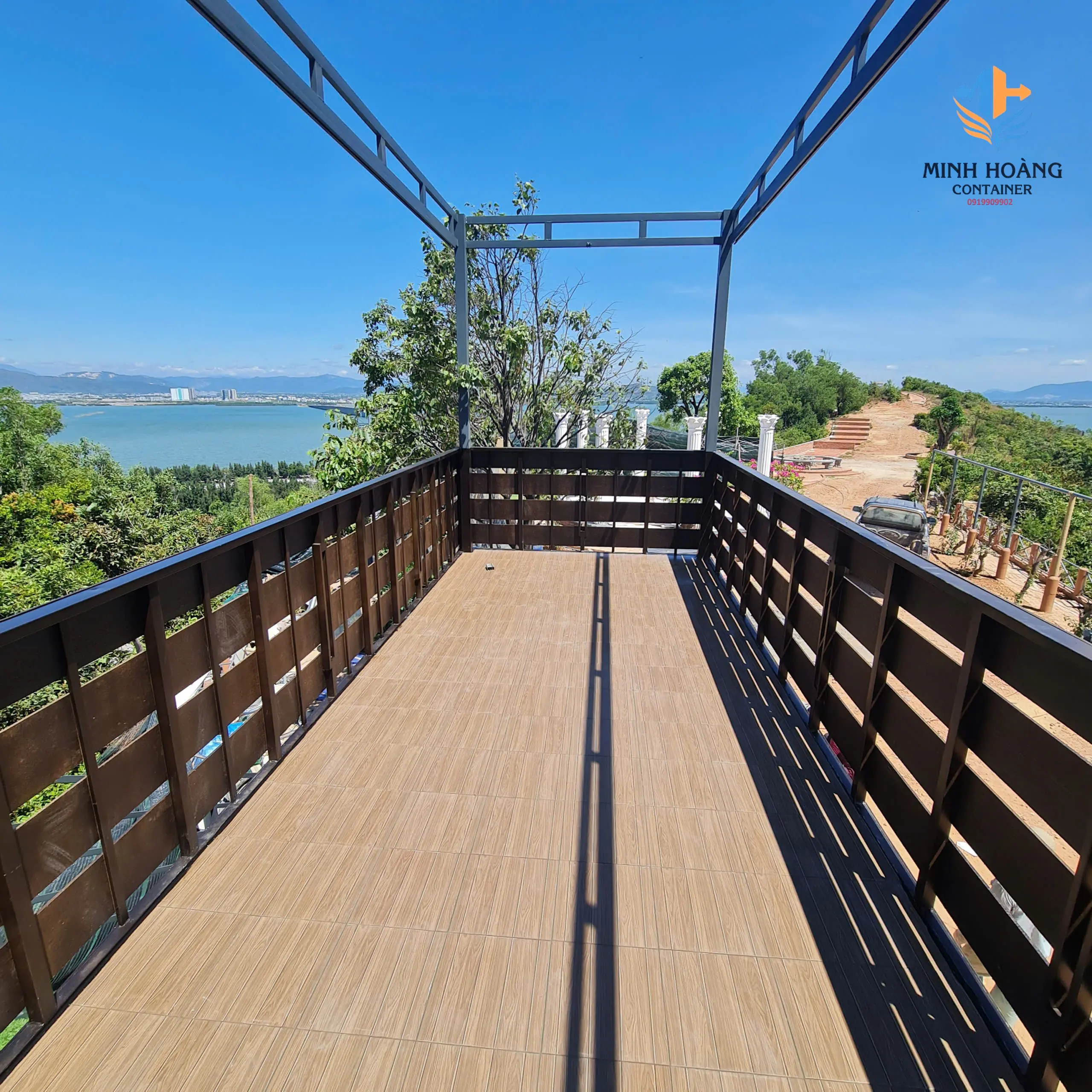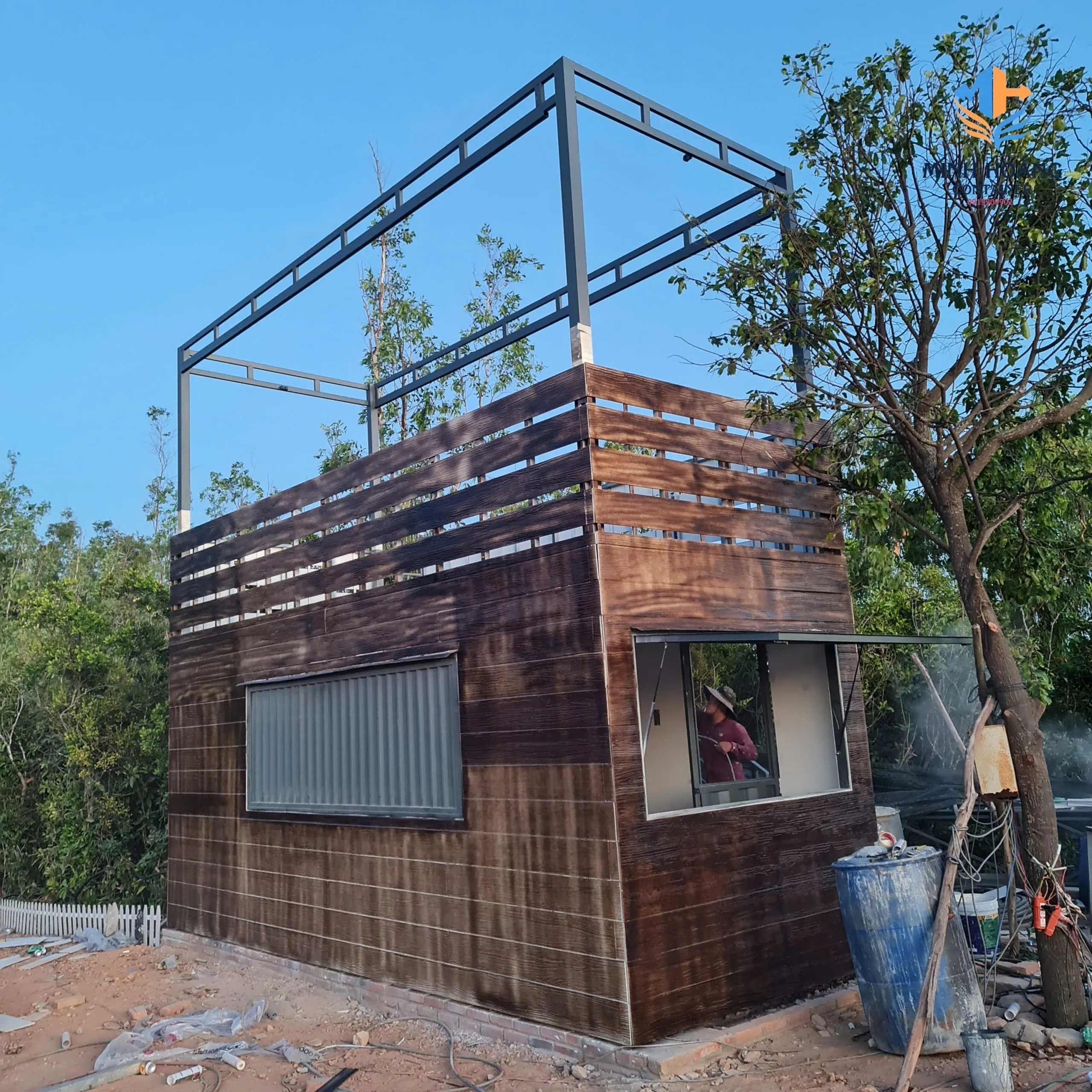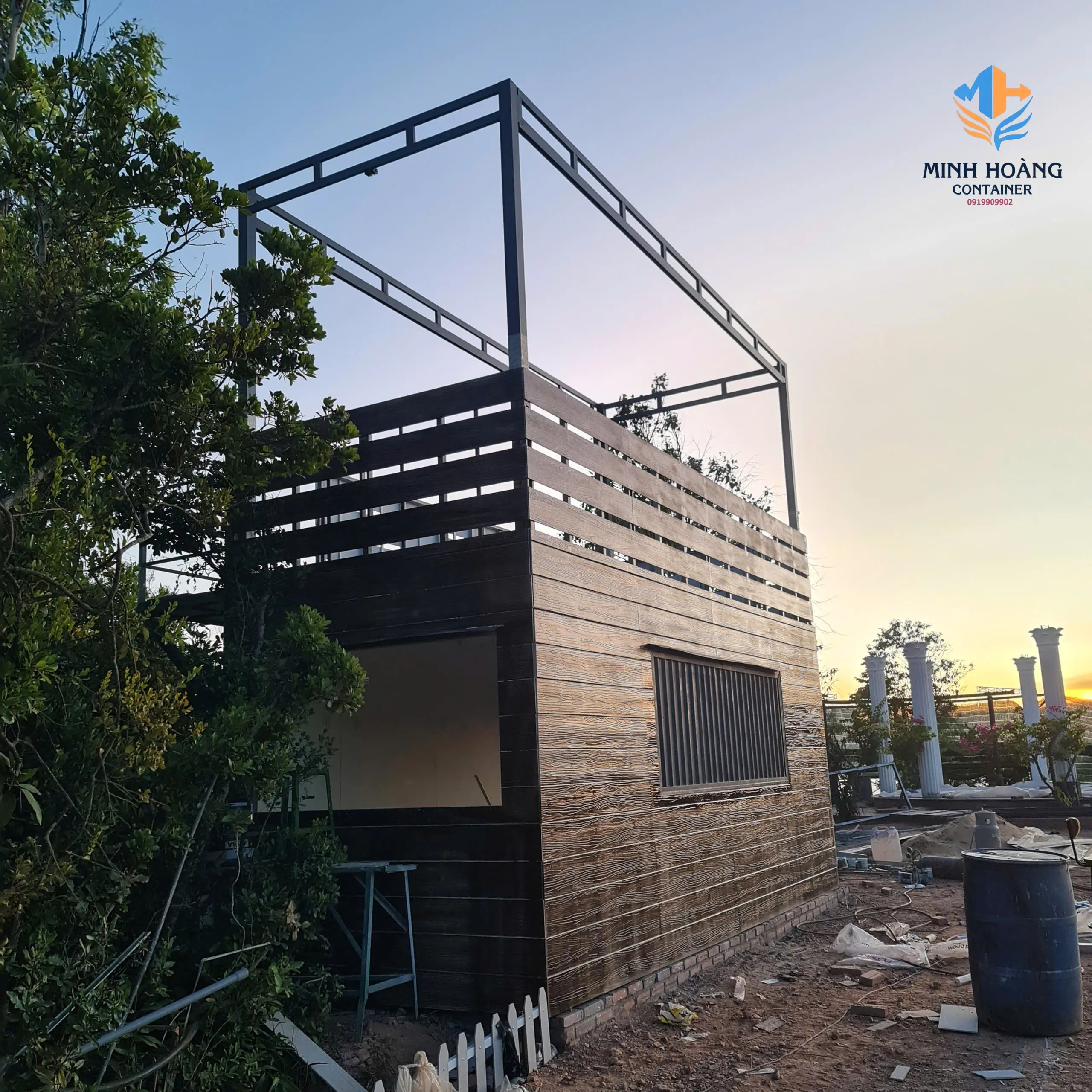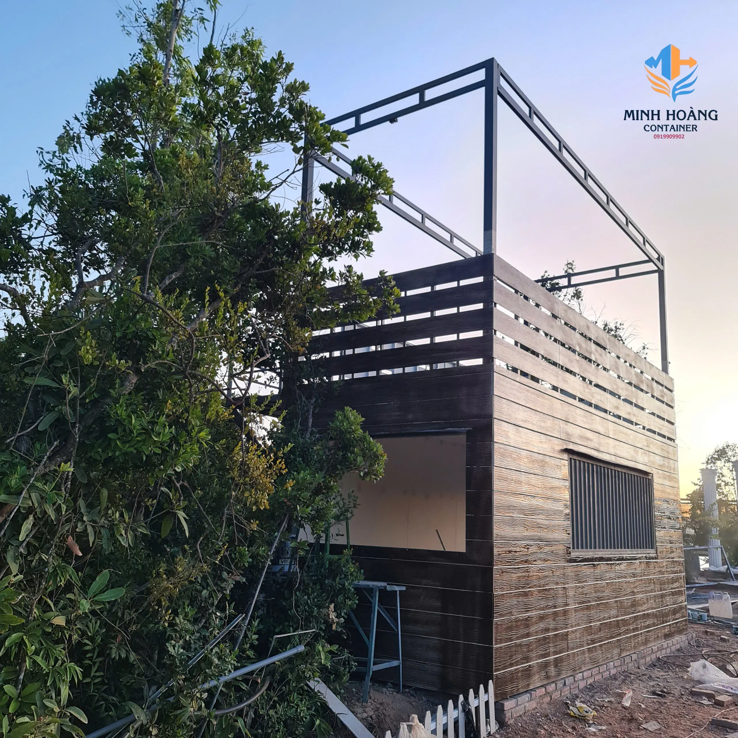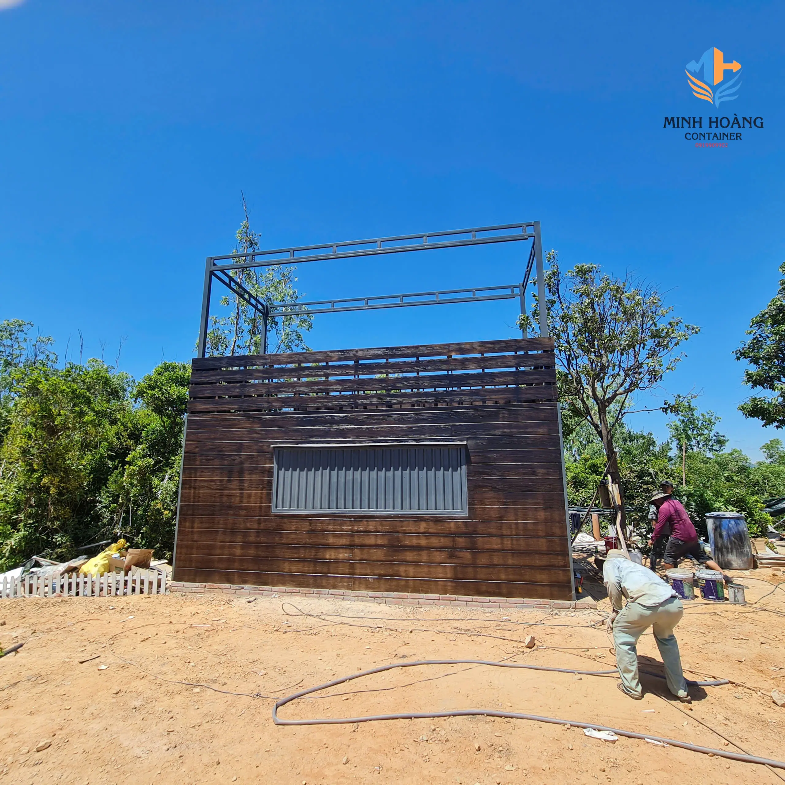 Điểm đặc biệt của mẫu thiết kế này là lớp vỏ ngoài được xử lý sơn giả gỗ tinh xảo. Công nghệ này không chỉ giúp container thoát khỏi vẻ thô cứng của kim loại mà còn tạo cảm giác gần gũi, cao cấp như các bungalow gỗ thực thụ, phù hợp với nhiều phong cách decor từ Vintage đến Hiện đại.