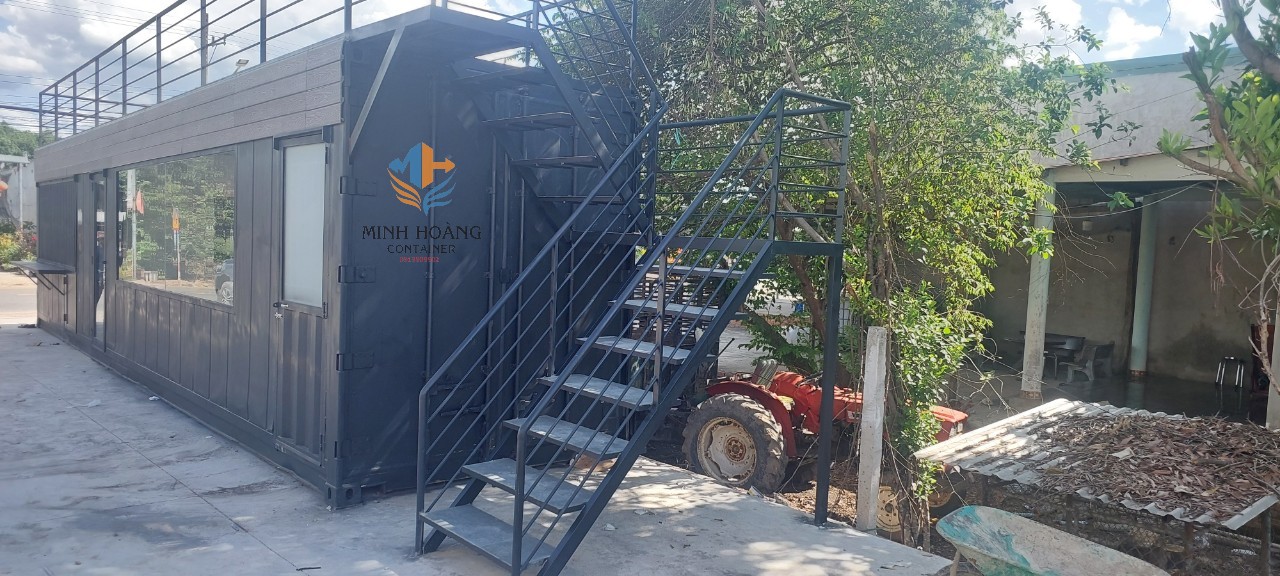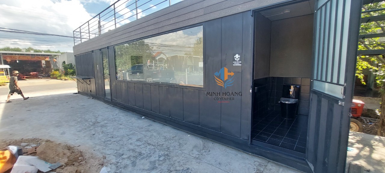 Container cafe 40 feet khung kính có toilet và sân thượng màu đen tại Bình Dương