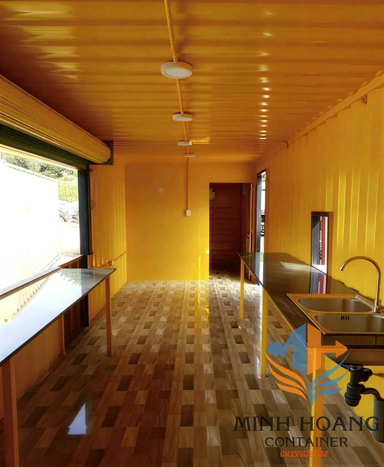 *Container không cách nhiệt, điện đi nổi trong ống nhựa, sàn lát gạch vân gỗ, ngăn 1 phòng nhỏ 2m, phần giữa 8m trang bị khung sắt lắp mặt đá, bồn rửa, toilet 2m ngăn 2 phòng