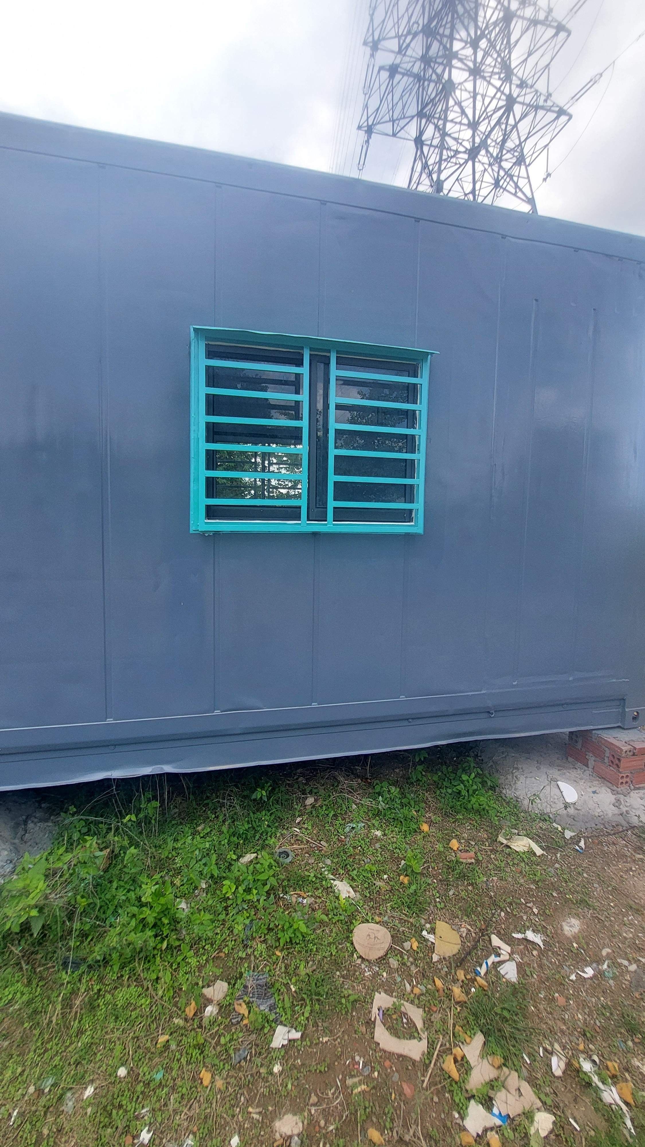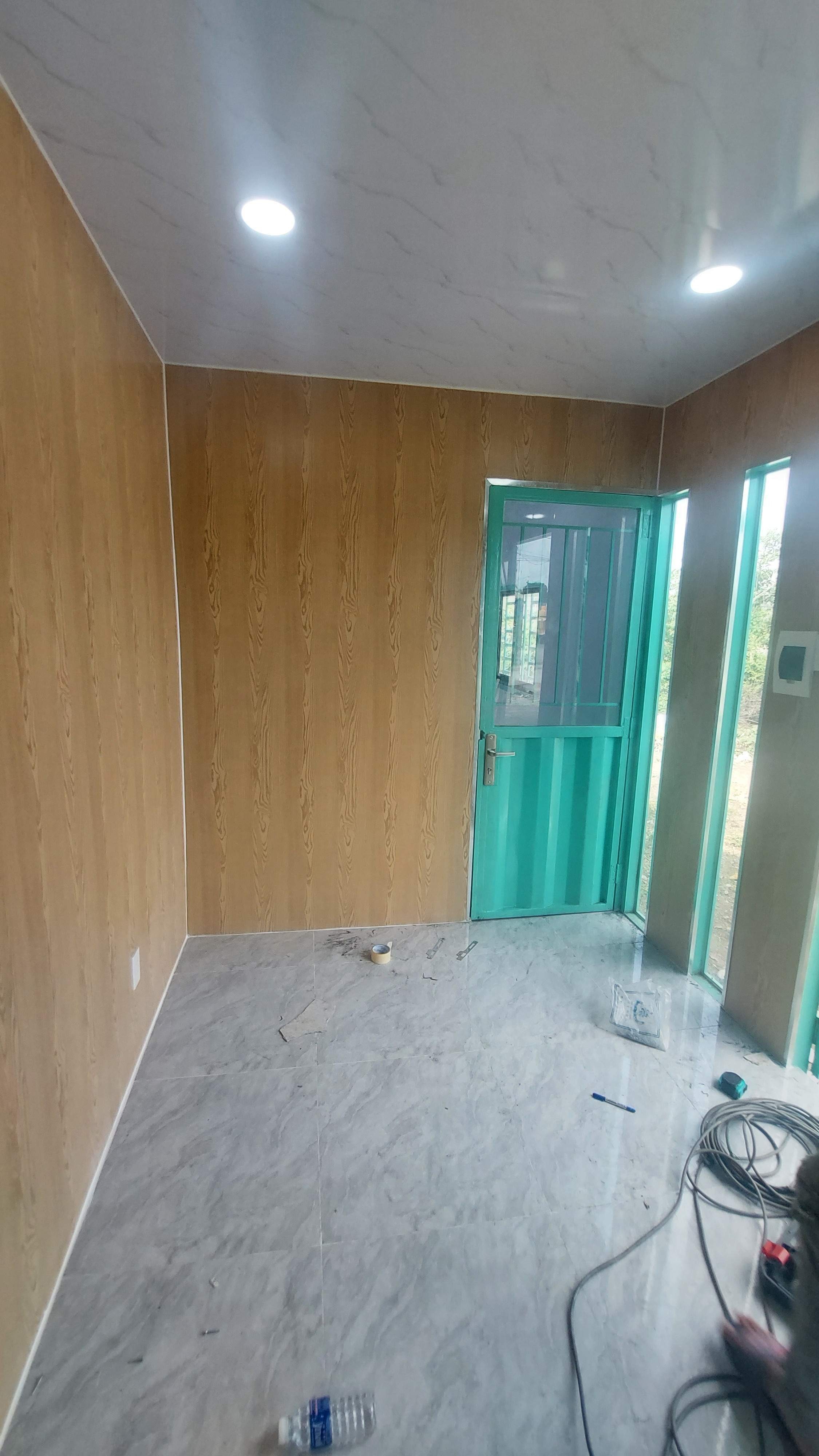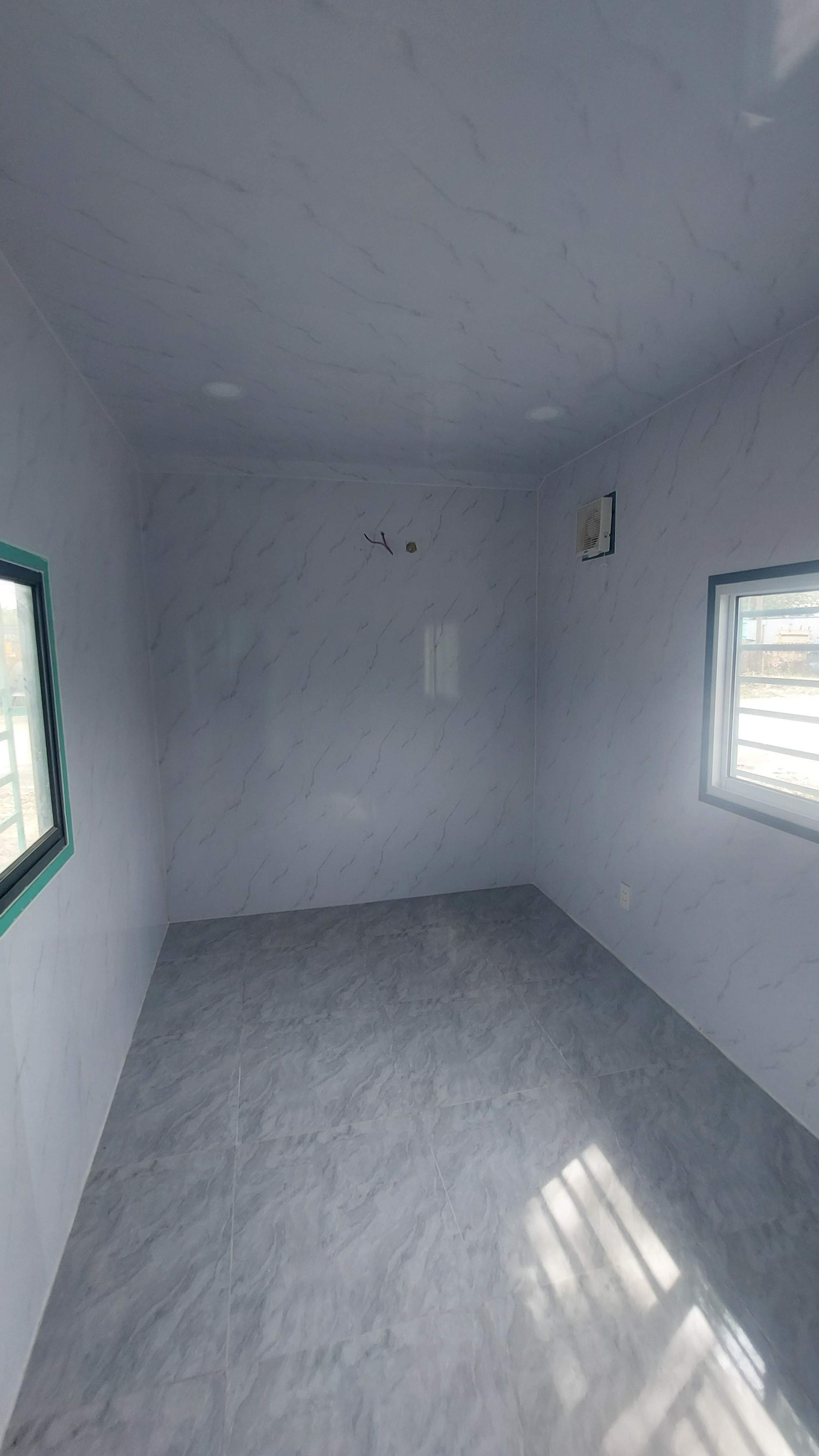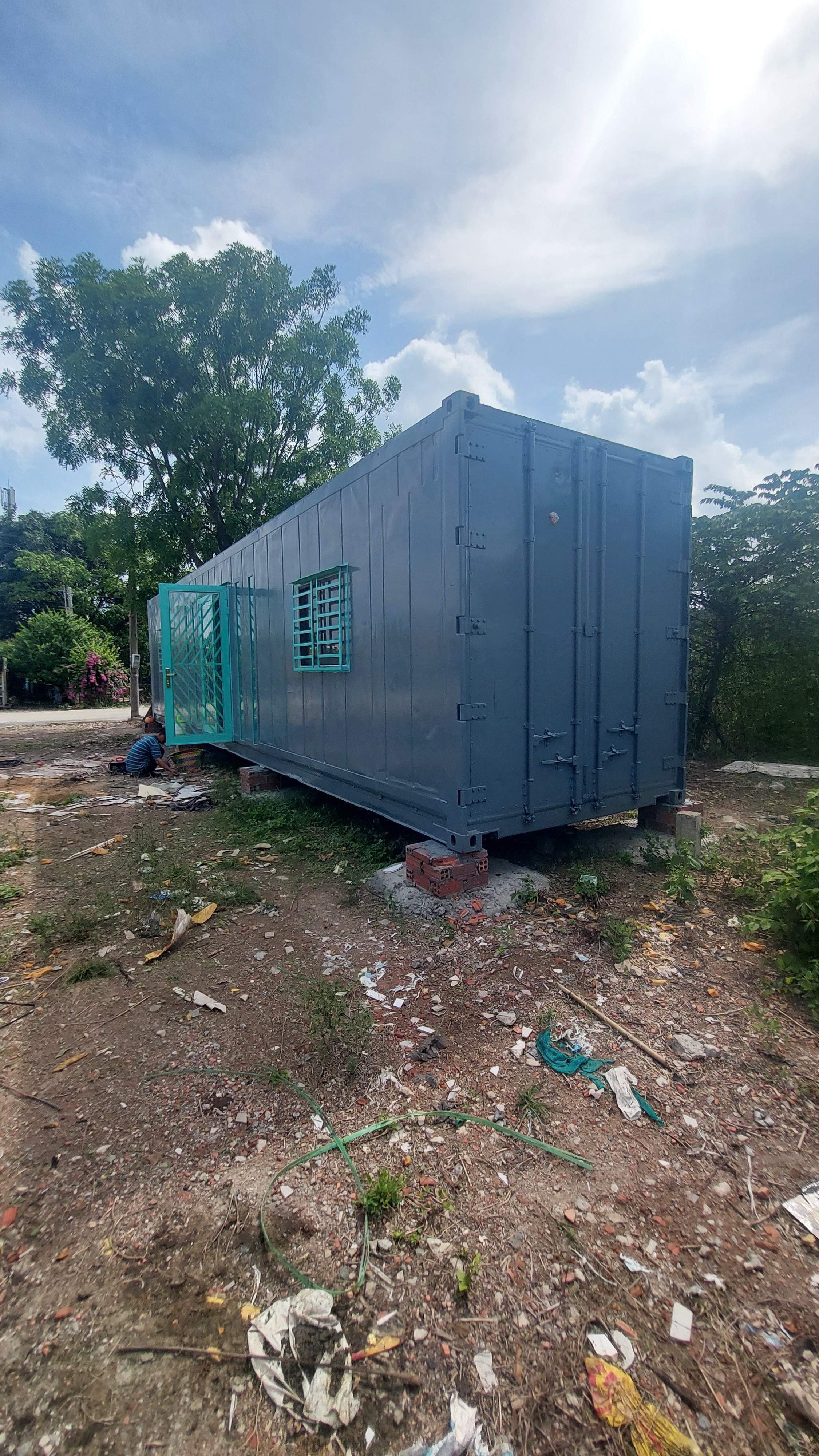 Nhà container 40 feet màu xám xanh đầy đủ điện, đèn, quạt hút, máy lạnh