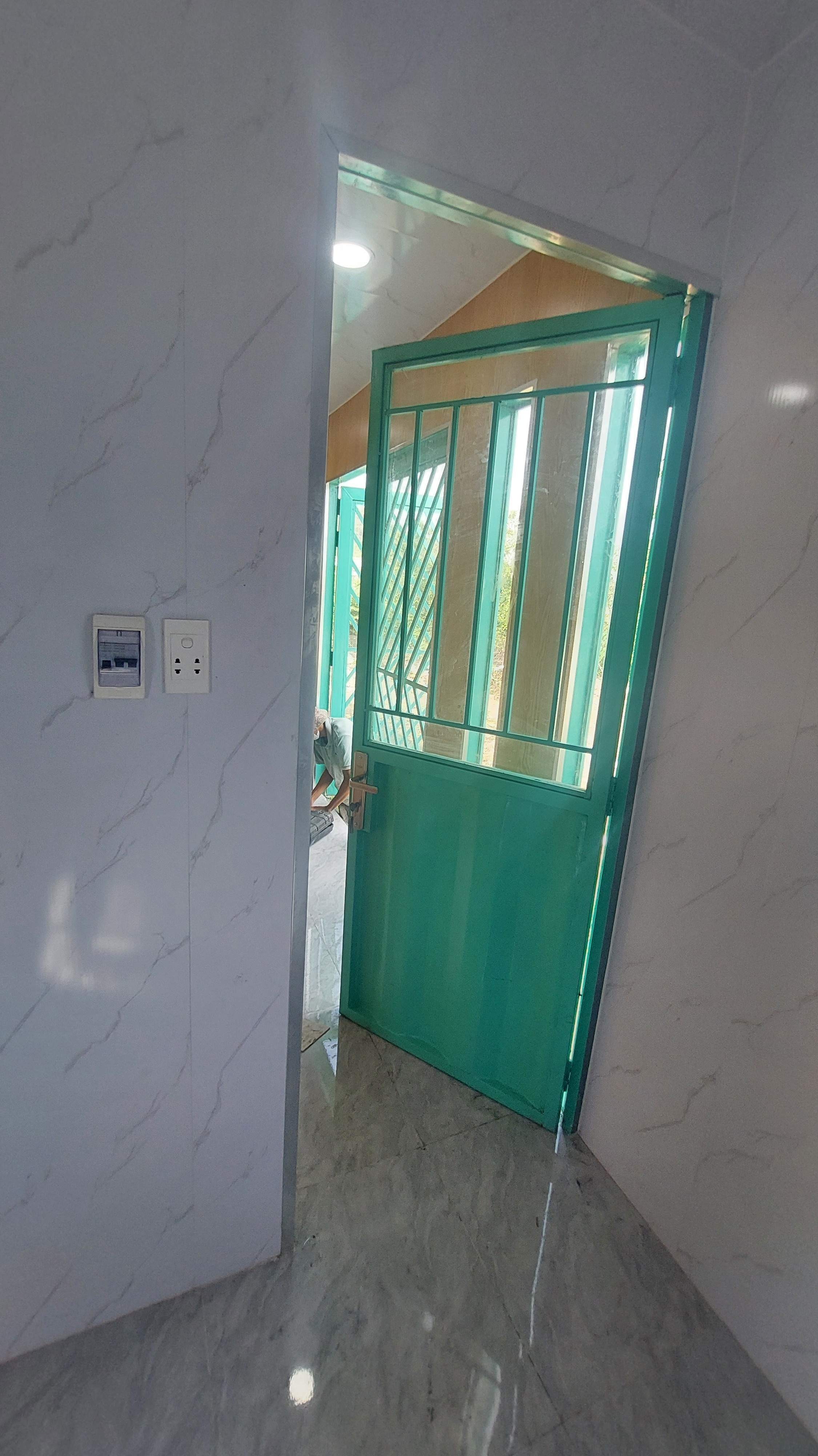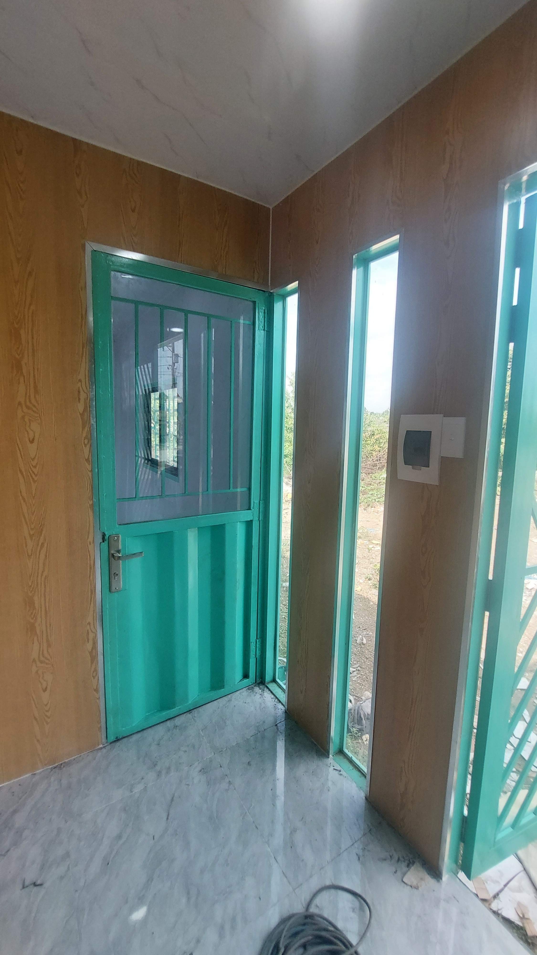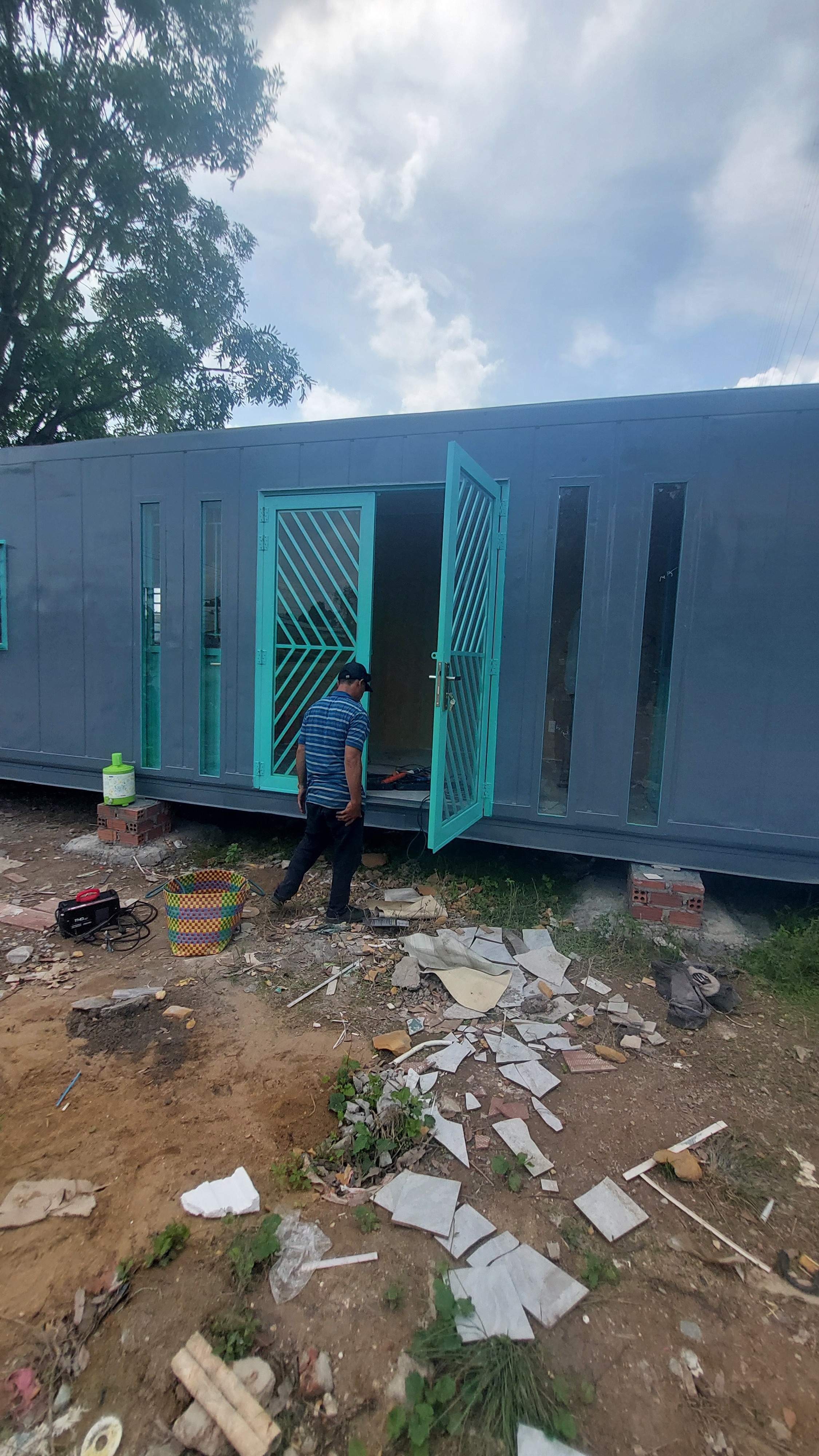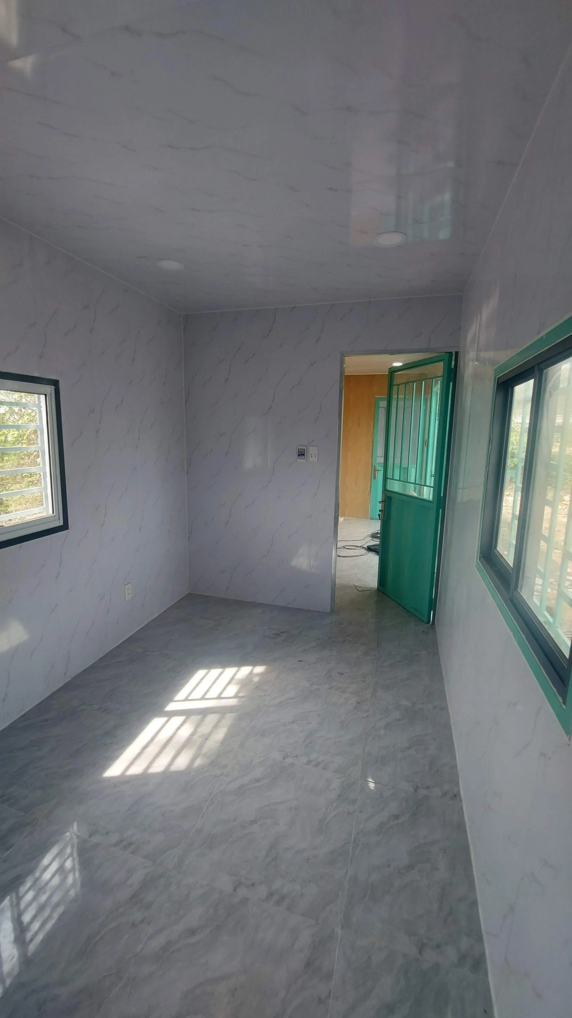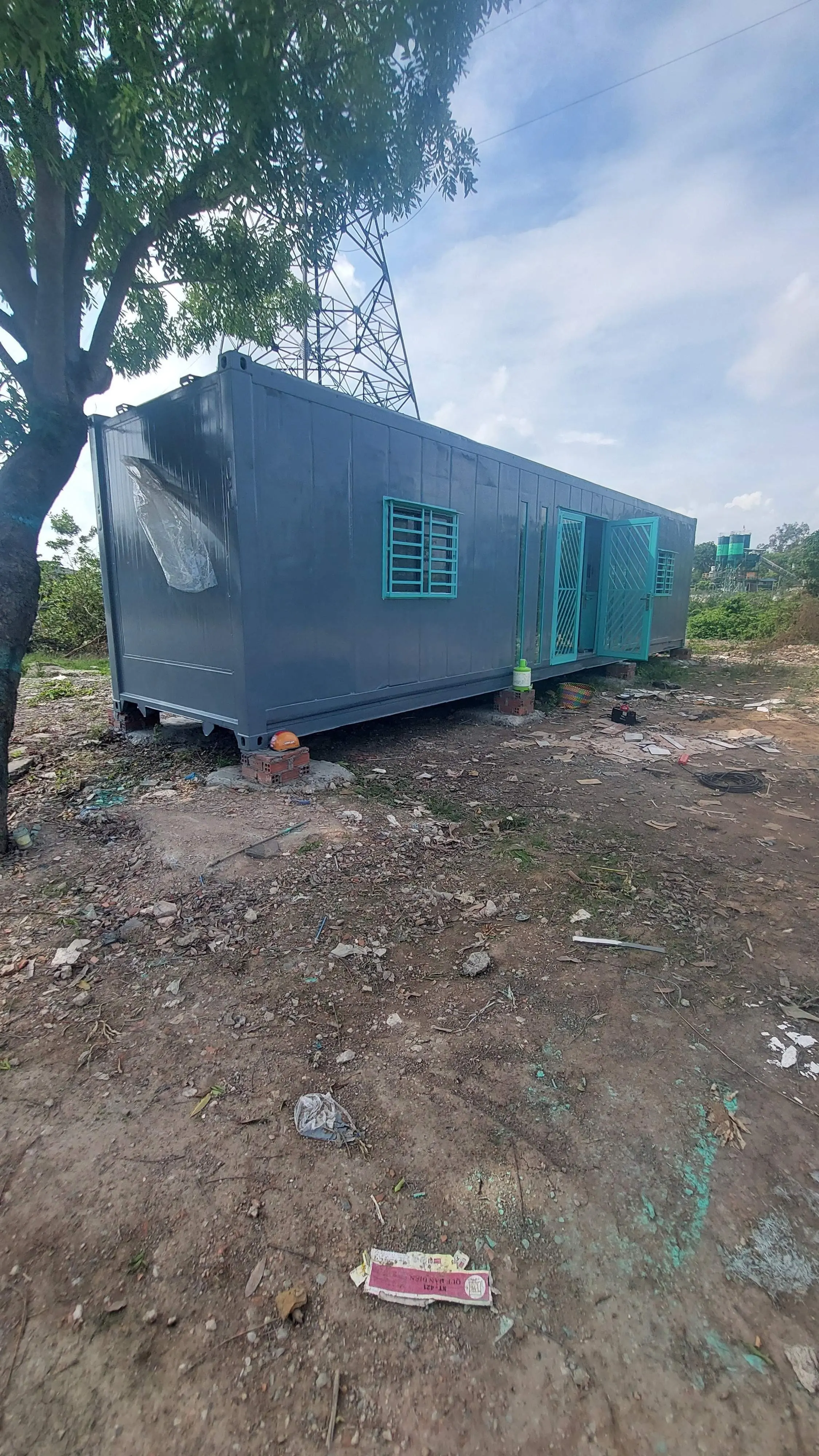 Nhà container 40 feet màu xám xanh đầy đủ điện, đèn, quạt hút, máy lạnh