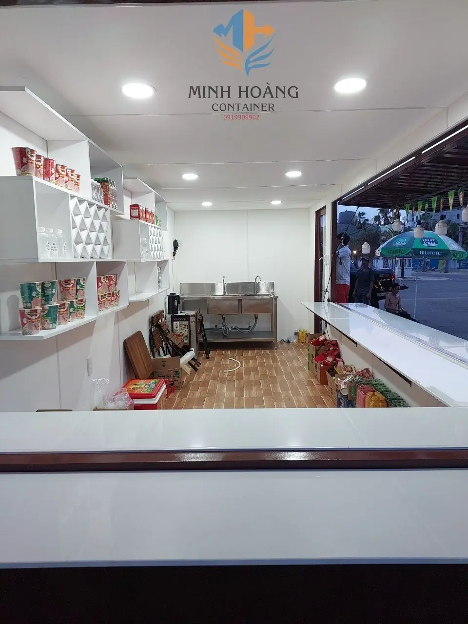 + Bên trong cont: Thiết bị điện, đèn led đi viền xung quanh, sàn lát gạch, cửa kính, mái bật