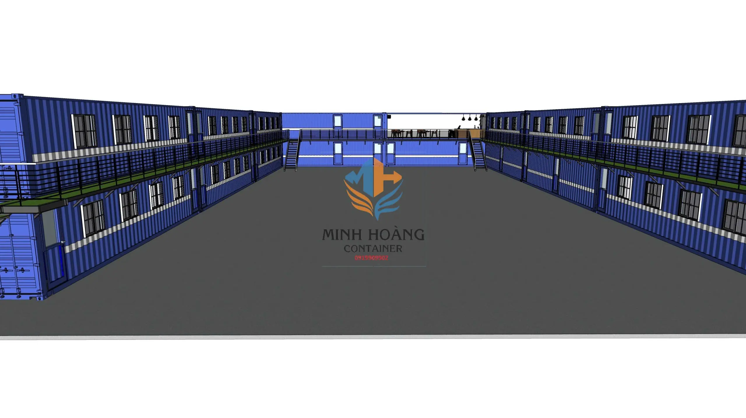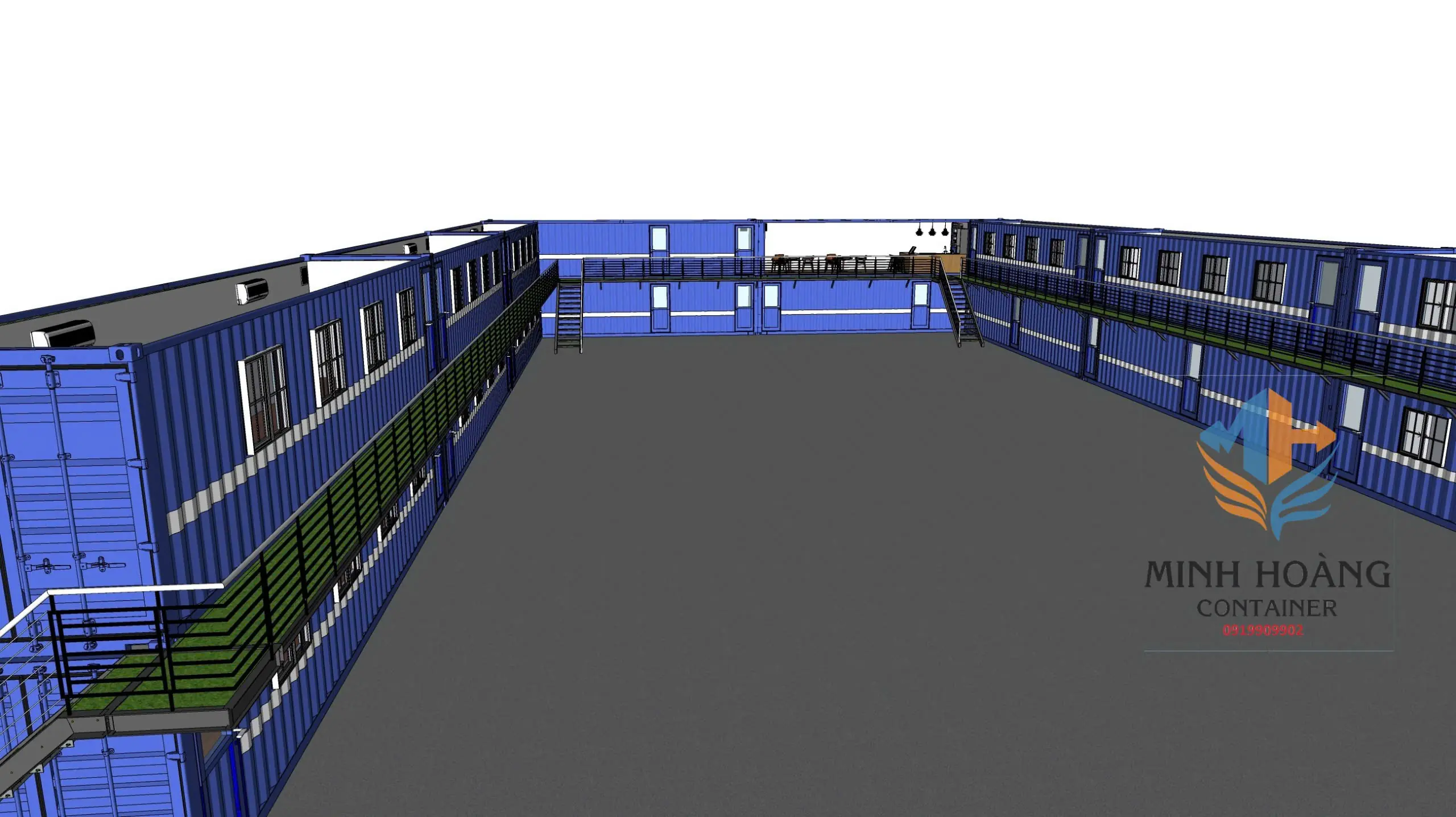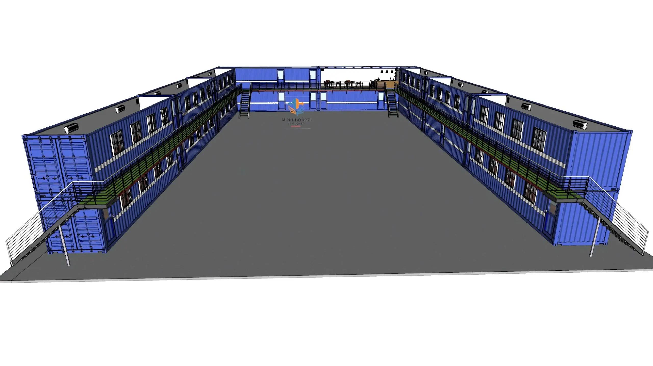 Thiết kế chồng tầng thông minh: Sử dụng hệ thống cầu thang thép và hành lang ban công kết nối giữa các khối container, tối ưu hóa diện tích sử dụng trên cùng một mặt bằng.